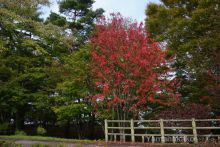 ポツポツと赤い葉をした木があります。