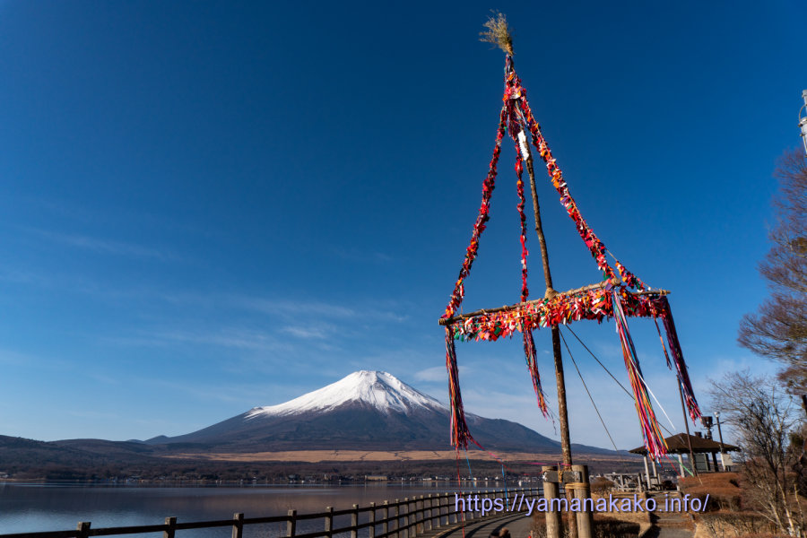 どんど焼きの御神木昨日は山中湖村内の各所にて御神木を立て、正月飾りや書き初めなどを燃やす小正月行事のどんど焼き(道祖神祭、御神木祭)が行われました。写真は長池地区の御神木で、これから1週間ほど立っている予定です。
