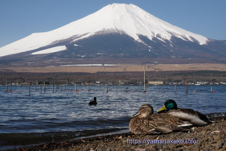 22年01〜04月 湖畔の鴨のつがい 2022年4月8日 山中湖人 コメントする 湖畔でくつろぐ2羽のカモ長池湖畔に行ったら、雌雄のカモが岸でくつろいでいたので、そっとカメラを向けてみました。やっと春になってきてそろそろ旅立ち、その前の英気を夫婦で養っているって感じでしょうか。今朝は富士山もきれいに見えました。 今朝の最低気温は2.7度で朝からプラス気温で、8時前には10度を超えたので、日中は昨日の最高気温の15.4度を大きく超えそうな感じです。昨日までは晴れ予報でも雲が多めでしたが、今日はすっきりと晴れていて爽やかな陽気となっています。 午前10時の状況 気温:14度 天候:晴れ 道路状況:山中湖周辺道路に凍結はありません Tweet Check Share on Tumblr