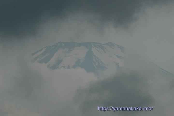 曇り空で富士山かくれんぼ昨日は曇っていても富士山全景が見られましたが、今日は写真のようにただの曇り空に見えましたが、よ~く見ると中央部の色がちょっと違うような・・・。見慣れてないと見逃してしまいそうなかくれんぼ富士山でした。拡大してコントラスト等をいじったら、なんとか富士山頂とわかるレベルになりました(笑)