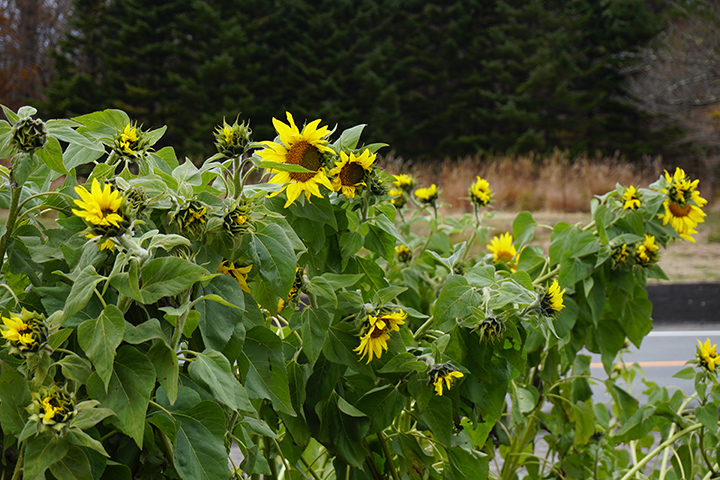 花の都公園入口付近に少しだけあったひまわりは、10日ほど前から少しずつ咲き始めましたが、1週間前の強風で倒れてしまったので、立て直し少しですが花が増えてきました。10月23日に霜が降りて、他の花は全滅でしたが、ここは川の近くだったので霜が降りずにここまで育ちました。ただ明日は氷点下3度の予報なので、今日が最後かもしれません。