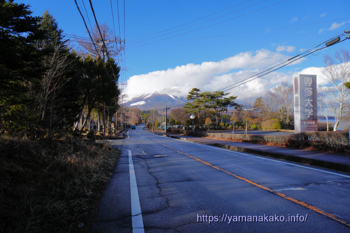道路状況:山中湖周回道路に凍結はありませんが、脇道や日陰には凍結箇所あり
