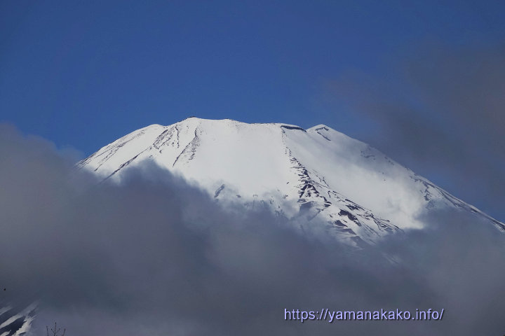 富士山頂今日は雲に遮られて富士山は見えませんでしたが、9時頃に山頂がちょっとだけ見えました。昨日の山中湖は冷たい雨だったので、富士山はまた雪化粧かと思いましたが、雪は降らなかったようで黒い山肌が見えていました。
