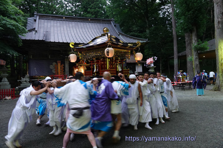 平野天満宮祭の神輿14日から平野天満宮の例大祭が行われており、神輿渡御は昨年と同様幣束は境内に置いたままで、14日に御旅所に向けて出発し、露払いは神楽舞が行い村中を練り歩き、15日のまだ明るい内に本殿に到着しました。以前は夜中までかかっていた神輿渡御ですが、諸般の事情により今後はこの時間帯に変更となるようです。本日は、氏子各戸を回り神楽を舞う「悪魔っ祓い」が行われています。