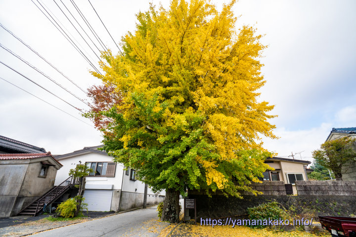 袈裟がけの銀杏山中明神前交差点近くにある大きなイチョウの木が、ちょうどいい感じに黄葉していました。この木は袈裟がけの銀杏と呼ばれ、日蓮聖人が1268年に山中本陣(坂本家)に泊まった折に袈裟をかけたとされています。村道拡幅工事の際にも日蓮聖人を偲んで伐採されず現在に至っています。木の幹周りは約3mあり、平野地区にある寿徳寺のイチョウの木とともに山中湖村の銀杏巨木として大事に守られています。(山中ぶらり裏道散策より抜粋引用)