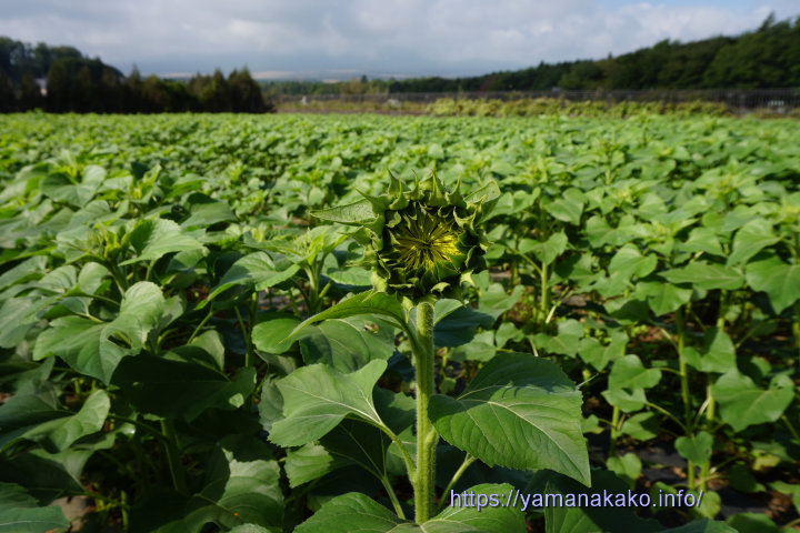 ひまわり畑今年も花の都公園では秋に咲くひまわりが、だいぶ育ってきて写真のようにつぼみも膨らんできました。例年10月初め頃に満開となりますが、今年はいつまでも暑いので少し早いかもしれません。
