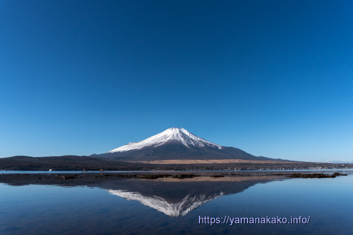 青空の下に逆さ富士今日は雲一つない天気で、すっきりとした青空の下に富士山が見えたので、逆さ富士の見える場所を探して、空も湖も青い中に富士山を入れてみました。ちょっと風が吹いていたので逆さ富士は歪んでます(^_^;)