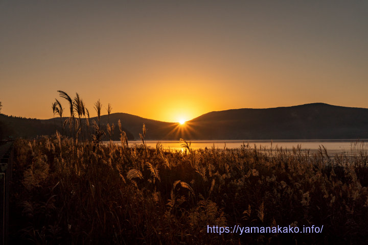 三国峠から昇る日の出長池湖岸から見る日の出は、今の時期は三国山と明神山の間からで、ちょうど三国峠から昇るような感じです。今朝は少し空気が霞んでいてオレンジ色に輝き、光芒も見られたので、ダイヤモンド三国峠と名付けてみました。
