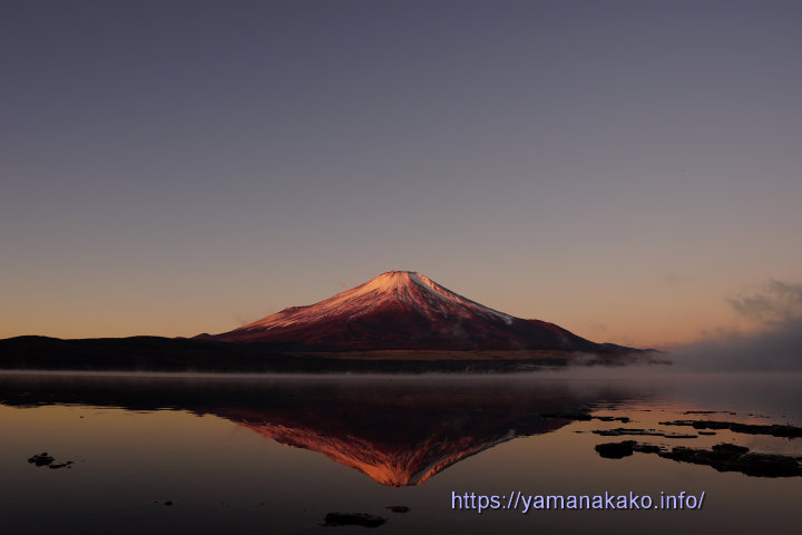 25年09~12月 紅富士の逆さ富士 2025年12月5日 山中湖人 コメントする 紅富士の逆さ富士今朝も冷え込み、写真の場所では空気が澄んでいて、早朝からすっきりとした富士山が見え、紅く染まりました。小さな入り江になっているようなところでは、写真のような紅富士の逆さ富士が見られました。 今朝の最低気温は-8.2度で昨日よりさらに下がり、今シーズン一番の冷え込みとなりました。ただ9時前にはプラス気温となり、10時には昨日の最高気温の3.4度を超えて、ほんの少しは暖かく感じます。 午前10時の状況 気温:4度 天候:晴れ 道路状況:山中湖周辺道路に凍結はありませんが、朝晩は霜に注意 Tweet Check Share on Tumblr