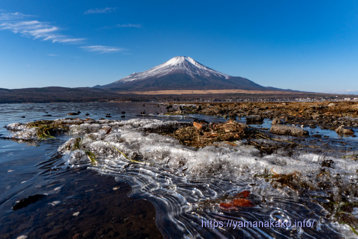 25年09~12月 湖畔の氷 2025年12月8日 山中湖人 コメントする 湖畔の氷今朝は昨日までよりは冷え込みが和らぎましたが、湖の縁には氷があって、それが層の模様になっていて、なかなかめずらしい光景でした。これから冬の間は、湖畔の氷の造形物を見るのも楽しいです。 今朝の最低気温は-4.7度で、昨日までは4日連続で氷点下7度以下だったので、あまり寒くは感じませんでした(充分寒いんですが・・・)。そして8時過ぎにはプラス気温となり、日差しがあるので、今日は昨日の最高気温11.0度を超えて暖かい日となるようです。 午前10時の状況 気温:9度 天候:晴れ 道路状況:山中湖周辺道路に凍結はありませんが朝晩は霜に注意 Tweet Check Share on Tumblr