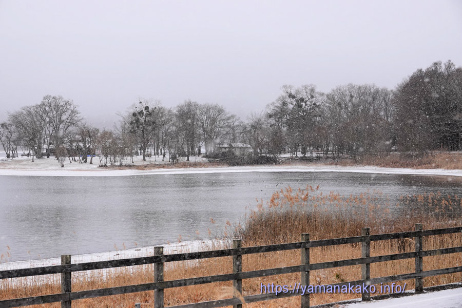 雪が積もっている平野湖畔山中湖の東側の平野地区では朝から雪が降っていて、平野ワンドでは写真のように真っ白になっています。9時頃ではまだ道路に積雪はなくスムースに走行できましたが、今後の様子では積雪するかもしれません。