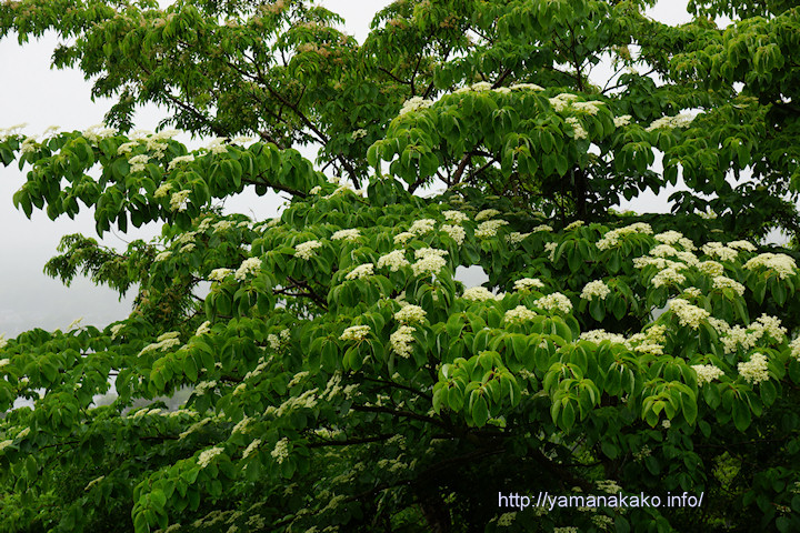 先日まで咲いていたズミの花が散り、山中湖周辺では白くなっている木を見かけるようになり、多くは写真のようなミズキの花です。大きな木もありなかなか接近して撮れませんが、花は小さく密生しているので遠くから見ると白い塊に見えます。