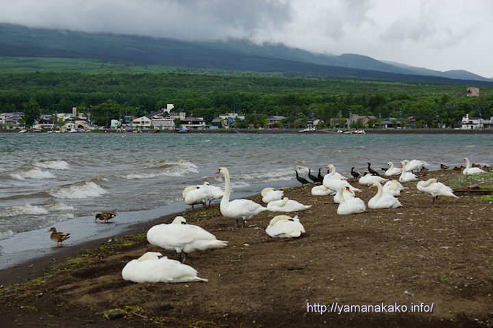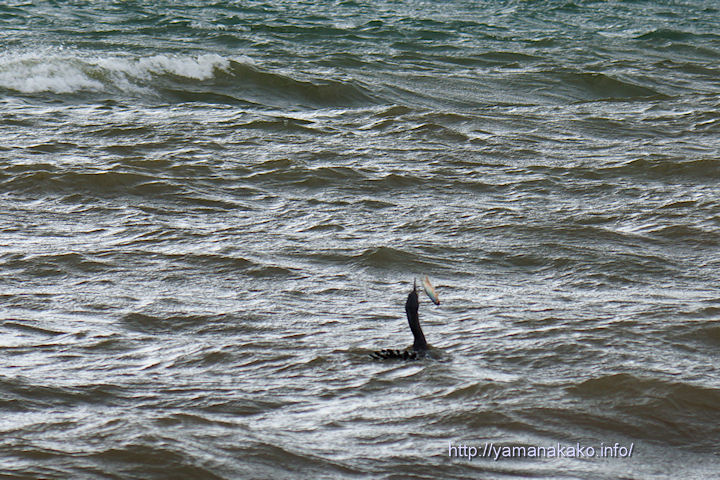 いつもは湖を優雅に泳いでいる白鳥ですが、今日は波が高いせいか岸でくつろいでいました。鵜や鴨も岸辺に並んで沖を眺めていましたが、1羽の鵜は波にもまれながら漁をしていて、見事に朝食をゲットしていました。