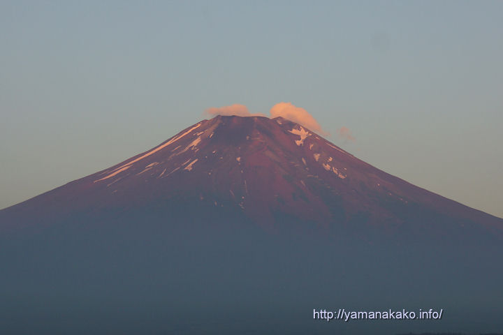 霞んで赤富士とは呼べないかな昨夜のから月が出ていて富士山の山小屋も薄ぼんやりと見えていたので、赤富士狙いで今朝は早起きしてみましたが、霞んでいてあまり赤くはなりませんでした。山の上から見ればもう少しきれいに見えたかもしれません。