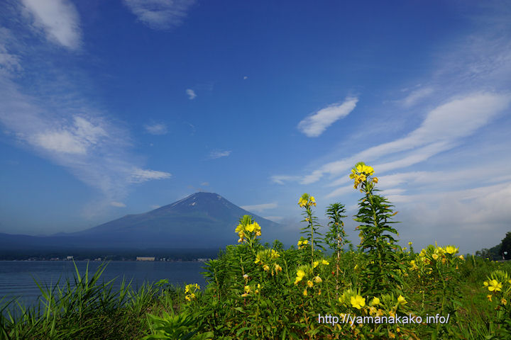 山中湖畔に咲く待宵草2012年は山中湖の水量が多く湖畔が狭く、待宵草はほとんど咲いていませんでしたが、昨年からまた従来並の水量となり、湖畔も広がってきたので、また待宵草がたくさん生えてきて、開花の時期となりました。今朝は7時半頃まで写真のように富士山が見えていましたが、その後は雲に覆われて見えなくなっています。