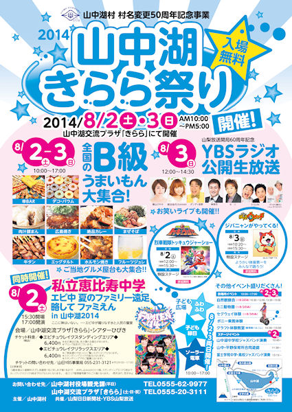 8月2日(土)、3日(日)は山中湖交流プラザきららにて、恒例のきらら祭りが開催されます。