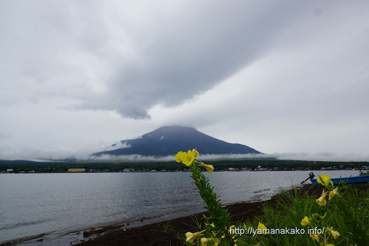今日は朝から雨が降ったりやんだりしていて10時頃までは富士山は見えませんでしたが、11時頃には山頂は見えないものの裾野の方まで見えるようになりました。笠雲と吊し雲のように見えますが、空も雲に覆われているのでよくわかりません。