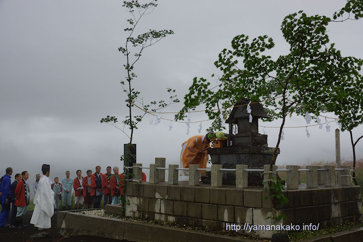 9月4日から始まる山中諏訪神社例大祭「安産祭り」に先立ち、本日は明神山頂上(鉄砲木ノ頭)にある山中諏訪神社奥宮で、神霊の降臨を願って参拝する「奥宮祭」が、あいにく小雨が降る天候の中、関係者が集まり無事行われました。