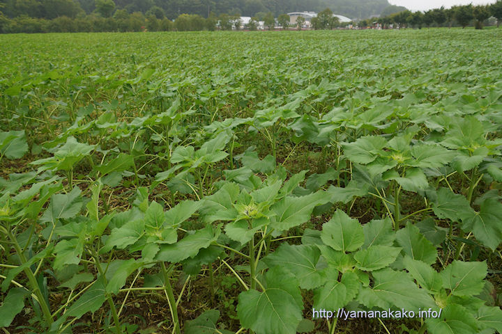 つぼみのひまわり昨日は県道沿いのひまわりがまだ咲いていて、富士山をバックに見られましたが、今朝確認したところ、ほとんど散ってしまい咲いているのはほんのわずかとなっていました。県道からは離れたところのひまわり畑では、写真のような状況でまだ小さいつぼみだったので、咲き始めるにはあと10日ぐらいかかりそうです。