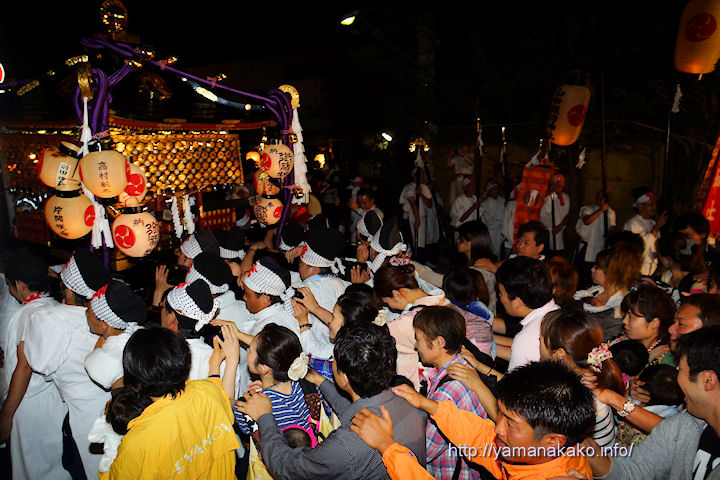 山中諏訪神社例大祭 安産祭り(宵祭り)昨日もお伝えしたように、4日から山中諏訪神社例大祭「安産祭り」が行われています。御旅所に神輿が到着した夜10時頃には、懐妊や安産を願う多くの人が神輿に連なり、神輿が御旅所に納まるまでの30分間が大いに盛り上がりました。本日が本祭りとなり、夜10時半頃に山中諏訪神社に神輿が到着する頃はさらに盛り上がります。