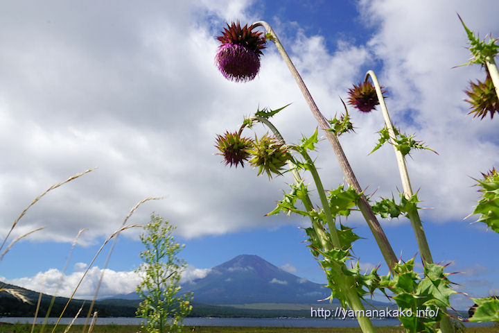 2009年まではきらら前の湖畔で毎年のようにフジアザミが咲いていましたが、2010年の台風による増水で湖岸が減少し、その後も毎年大雨による増水があり、なかなか湖畔のフジアザミが育ちませんでしたが、今年は何株も生えてきているのでこれからたくさんの花が咲きそうです。写真のように早くも咲き出したものもありますが、多くの花が見られるのは9月下旬頃だと思います。