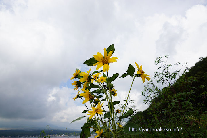 7月末頃紹介した湖畔に咲くひまわりは8月中旬まで咲いていて、もう散ったかと思っていましたが、湖畔道路を走っていたら黄色い花が目についたので近寄ってみたら、写真のようにまたひまわりが咲いていました。茎の先端は折られていて、大きな花はなくなっていましたが、1本の茎から枝分かれしたくさんの小さな花が咲いていました。