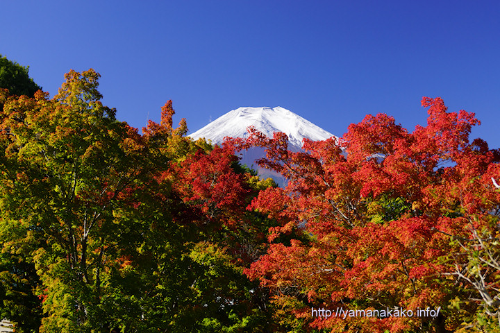花の都公園の清流の里では木々が色づき始めて、写真のように真っ赤に染まった木もあり、富士山も冠雪したので、秋らしい景色となっています。ただ、富士山をバックに撮るには高さがあってちょっと難しいです。