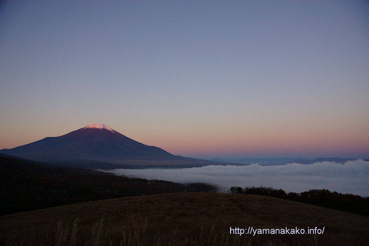 西の空のグラデーション今朝は山中湖が霧で覆われていて雲海となっていて、湖畔から富士山は見えなかったので、パノラマ台の少し上まで登って撮りました。富士山に日が当たる少し前から西の空がだんだんと赤みを帯びてきて、日が当たる頃には写真のような色になります。この場所からの富士山もきれいですが、刻々と変わる西の空のグラデーションもきれいなので是非早起きして見てください。