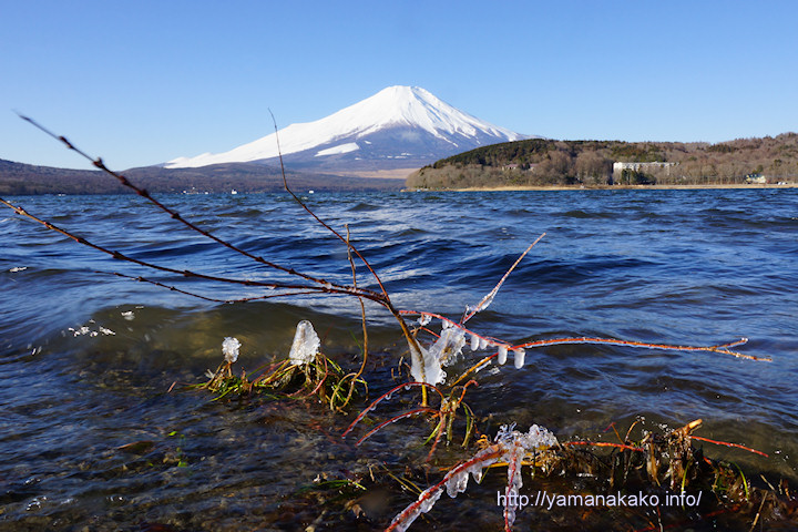 山中湖畔の氷遠くから湖畔を見てみるとキラキラと光っていたので近づいてみたら、写真のように波しぶきが枝に付着して凍っていました。もうちょっと冷え込むともっと大きな氷になると思うのですが今朝は写真のような感じでした。