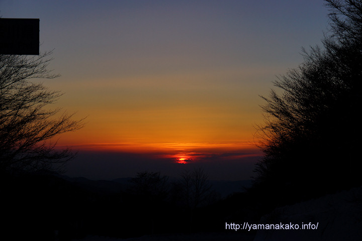 冬至の頃はもっと南側から日が昇り、右の山の影で道路からは見られませんでしたが、春に近づくにつれ日の出位置がずいぶんと東寄りになってきたので、道路からも写真のように見られるようになりました。あいにく今朝は霞んでいて海は見えませんでしたが、空気が澄んでいれば房総半島まで見られます。ちなみに左上に映っている■は、神奈川県と記載のある看板です。