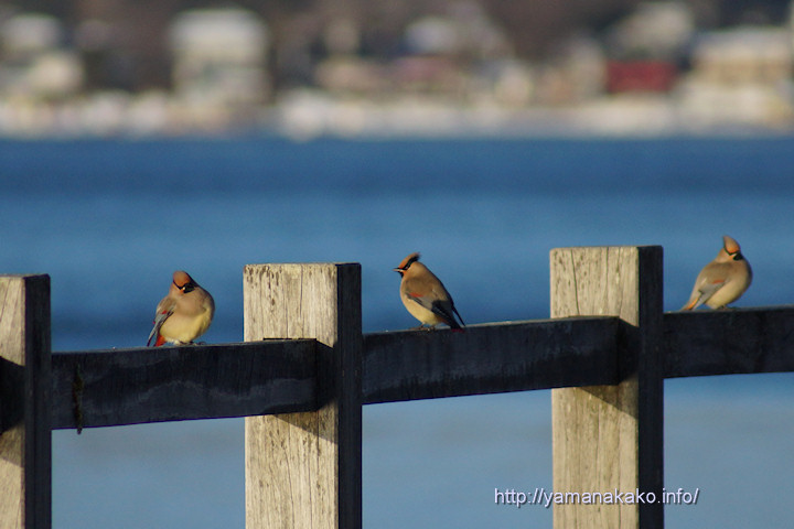 今朝は長池親水公園にあまり人が居なかったので、ヒレンジャクがサイクリングロード横の柵に止まってから水を飲みに湖畔に降りていました。