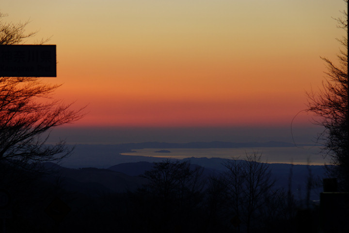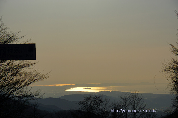 今朝は三国峠の県境から相模湾に浮かぶ江ノ島がよく見えたので、日の出前の明神山に登る前と降りてきてからの様子を撮ってみました。日の出前の空はとてもきれいで、よく見たことがありますが、日が高くなって太陽が海に反射してキラキラと光っている様子は初めて見ました。左上の黒い四角は県境を示す看板ですので、山中湖から見る海となります。
