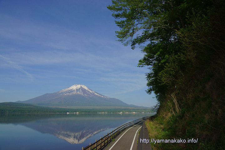 ままの森の下のサイクリングロード今朝は風がなく穏やかな山中湖だったので、写真のような逆さ富士が見られました。ここはままの森の下にある湖畔道路沿いのサイクリングロードで、今の時期は新緑がきれいでとても清々しく、自転車で疾走すると気持ちいいと思います。