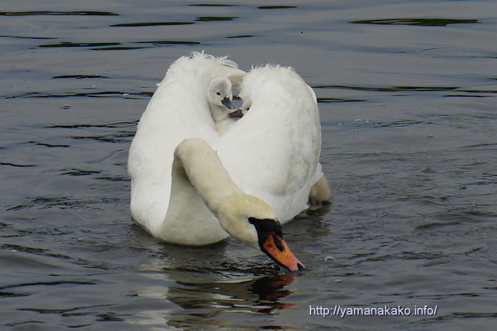 長池で生まれた白鳥は12日にお伝えしたようにずいぶんと大きくなってしまったので、今年はもう親鳥の背中に乗っている姿を見られないかと思っていましたが、14日(日曜日)に旭日丘で孵ったヒナたちが、今朝は親鳥の背中に乗っていました。1羽はずり落ちそうですがなんとかふんばってしがみついている感じです。