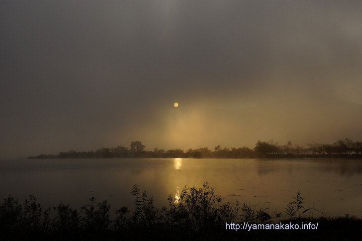 今朝の山中湖は霧に覆われていて、また白虹が出るかと思いましたが、白虹は見られませんでした。ただそこに向かう途中に霧を通してまん丸の太陽が見られ、光が霧に当たってセピア色の写真となりました。