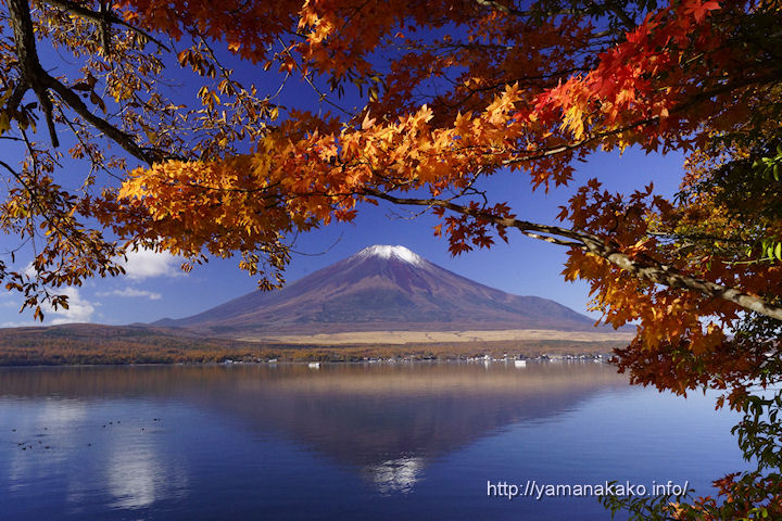 ままの森下の紅葉と富士山今朝も早朝の山中湖は霧に覆われていましたが、霧が晴れてからは赤く染まったモミジの下で、青い空と青い湖の間にきれいな富士山が見えました。