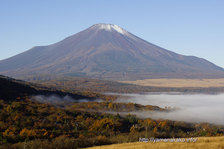 ここのところ3日続けてきれいな富士山が見えていて、紅葉も見頃なのでそんな写真を多く撮っていますが、今朝は富士山を大きく入れてみました。昨日一昨日と同じように、早朝の山中湖は霧で覆われていましたが、パノラマ台付近まで上がってくると霧は眼下の雲海となり、富士山がよく見えました。