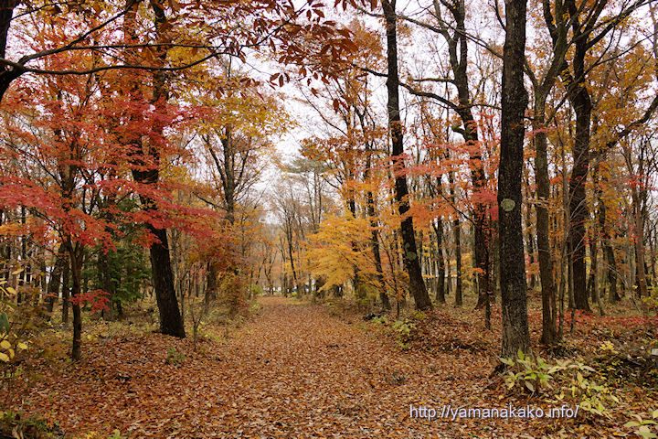 今日は晴れ予報でしたが朝からどんより曇っていて富士山は見えません。毎日紅葉ネタですが、今朝は山中諏訪神社裏手にある鎮守の森散策路からです。国道側から見るとまだ葉っぱが多く残っているように見えますが、中に入るとほとんどの木は葉を落として散策路も落ち葉で埋め尽くされています。
