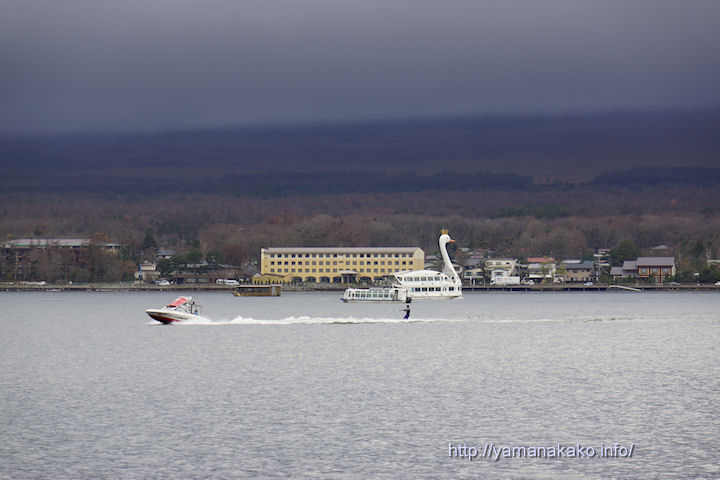 昨日の夜も雨が降りましたが、今朝からは曇り空となっています。そんな天候ですが、湖ではウェイクボードをしている人もいて、その向こうではドーム船と遊覧船も浮かんでいました。