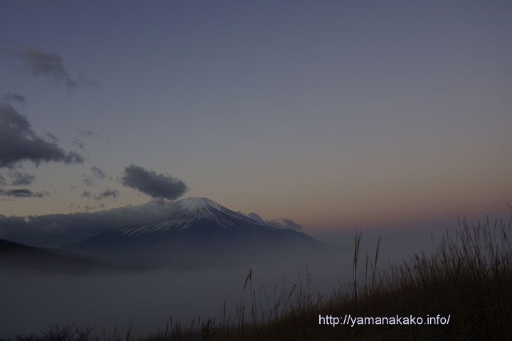 今朝の山中湖はすっぽりと霧で覆われていたので、パノラマ台まで行ってみましたが、めずらしくそこでも霧の中なのでさらに上に登り、富士山に日が当たる前に撮ってみました。日が当たるのを待っていたら、さらに霧が上がってきて、すっかり富士山は隠れてしまいました。ここまで霧が上がってくるのはめずらしいと思います。