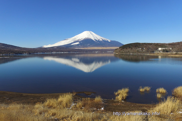 昨日は早朝の逆さ富士でしたが、今朝は8時半頃になっても風が弱かったので写真のような逆さ富士が見られました。また昨日の朝は湖畔を覆っていた雪もほとんどなくなってしまいました。