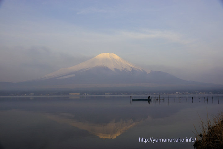 今朝は空気が霞んでいてきれいな富士山は見えず、また紅くもなりませんでした。ワカサギ漁はまだ盛んに行われていて、今朝も写真のように漁師が定置網にかかったワカサギを捕っていました。ワカサギ漁は来月末ぐらいまで行われます。