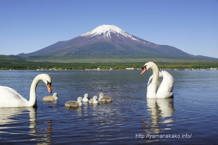 白鳥親子、5羽の赤ちゃんと先日、白鳥のヒナが3羽誕生したと投稿しましたが、今朝のこの場所の巣では5羽誕生し、早朝から元気に泳いでいました。昨日は見なかったので、今朝生まれたのかもしれません。この場所だと天気がよければ、こんな風に富士山をバックに泳ぐヒナたちが撮れますが、撮影する時は興奮させないようにそ~っと撮ってください。