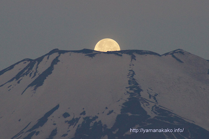 パール富士狙いで、半分月が沈んだ昨日、今日と山中湖畔から富士山頂に月が沈むパール富士が見られる日だったので、両日とも挑戦しましたがあまりきれいに撮れませんでした。昨日は定番の長池湖畔から撮りましたが、今朝はかなり多くの人がいた湖畔は避けて、山の中から狙ってみましたが、ちょうど半分ぐらい沈んだ時に月が真ん中に来る感じで、少々ポイントがずれてしまいました。次回はもう少しうまく撮れるよう、事前準備を行いたいと思います。