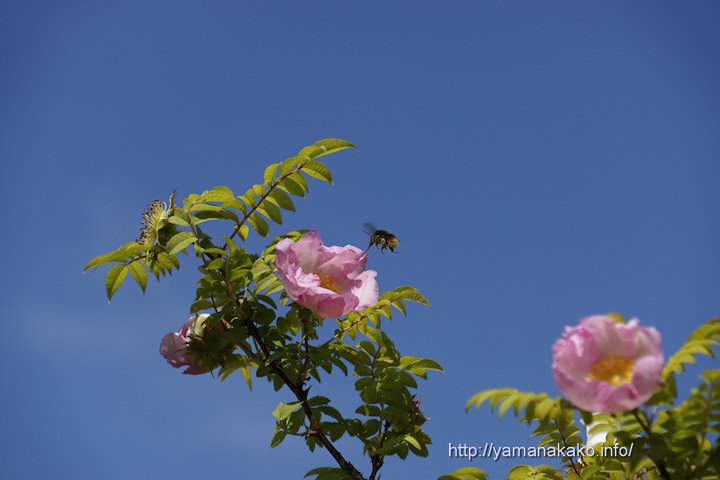 サンショウバラは富士箱根地方に生育していて、今がちょうど花期となっており容易に見られる場所としては交流プラザきらら、花の都公園そして村役場の庭などで、山中湖村の花に指定されています。葉が山椒、花がバラに似ていることからこの名となったようです。今朝はちょうどクマバチが飛んできたので一緒に撮ってみました。