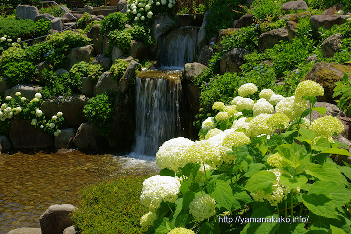 花の都公園の清流の里では、アジサイ(アナベル)が見頃となっているので、9時過ぎから晴れてきたので、涼しげな場所「岩清水の滝」で撮ってみました。まだ緑色もありますが、間もなく真っ白になりそうで、写真では少しだけに見えますが、たくさん咲いているので見応えがあります。