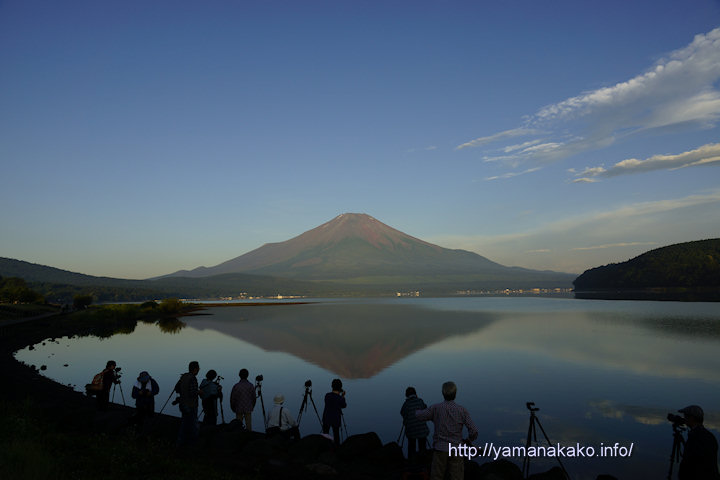 富士山撮影会今日は朝からいい天気で、きれいな富士山が見えたので、早朝からたくさんのカメラマンが湖岸から思い思いにシャッターを切っていました。この時期としてはめずらしく昨日から空気も澄んでいて、昨夜は星もきれいに見えたようです。