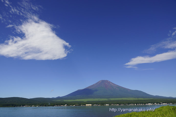 早朝は曇っていましたが、7時過ぎぐらいから青空が広がってきて、8時過ぎには写真のような夏の富士山が見られました。左の雲は最初、吊し雲のようになっていましたが、だんだんと薄くなってこの後すぐなくなってしまいました。
