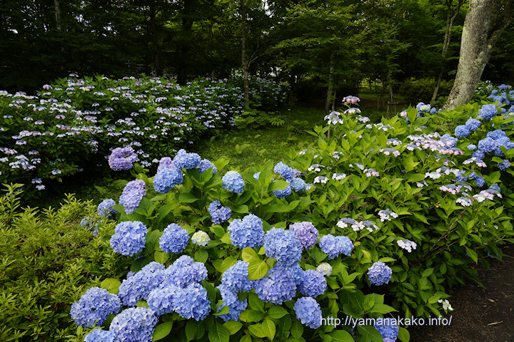 旭日丘湖畔緑地公園のアジサイが写真のようにちょうど満開で見頃となっています。公園全体で咲いているわけではなく一部だけで、写真の場所は夕焼けの渚展望台の下辺りです。これからの季節、ここの木陰は湖からの涼風がとても気持ちいいので、暑い日はここでちょっと休んでみるのがいいでしょう。