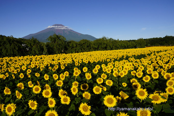 花の都公園のひまわりが写真のように満開になっていて、今朝はきれいな富士山をバックに見られました。こちらは県道から離れている場所で駐車場から離れているせいか、桜の木が邪魔なせいか、空いていて貸し切り状態でした。県道沿いのひまわり畑も満開で、他にも百日草やキバナコスモスも満開となっています。